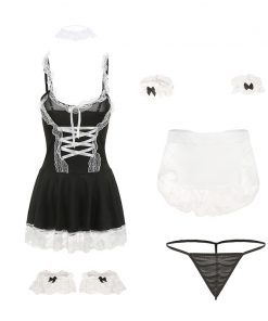 French Maid Cosplay Lingerie Set with Lace Trim and Garter